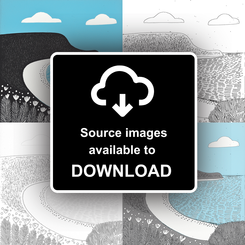 Capture the serene beauty of Rhossili Bay with our exquisite lino-print style artwork, part of our UK Picturesque Harbours and Beaches collection. This striking image features the iconic sweeping bay of the Gower Peninsula, encapsulating the harmonious blend of land and sea. The artwork showcases a bold, contrasting palette of black and white, with intricate line work depicting the textured cliffside and delicate seafront floral patterns. Set against a tranquil blue sky, the scene evokes a sense of calm and wonder, with fluffy white clouds softly punctuating the skyline. Available in either a sleek black or classic white frame, this piece is perfect for adding a touch of coastal charm to any room. Offered in 36cm and 46cm square sizes, this artwork is ideal for home décor enthusiasts and collectors alike. For a personal touch, download the source images, including line drawings and sketches, to create your very own lino print masterpiece.