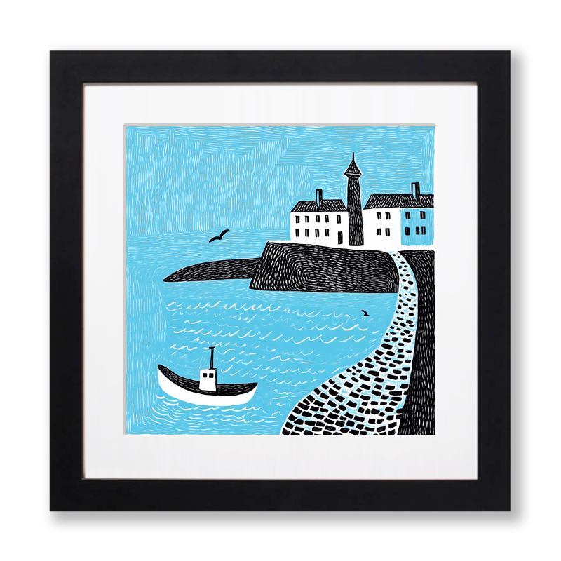 Experience the charm of St Ives Harbour with this exquisite lino-print style artwork, part of our UK Picturesque Harbours and Beaches collection. This stunning piece captures the rustic beauty of Cornwall's iconic harbour, featuring a quaint fishing boat and characteristic buildings set against a serene, turquoise sea. The artwork utilizes a limited colour palette to evoke a sense of nostalgia and simplicity, reminiscent of traditional printmaking techniques.