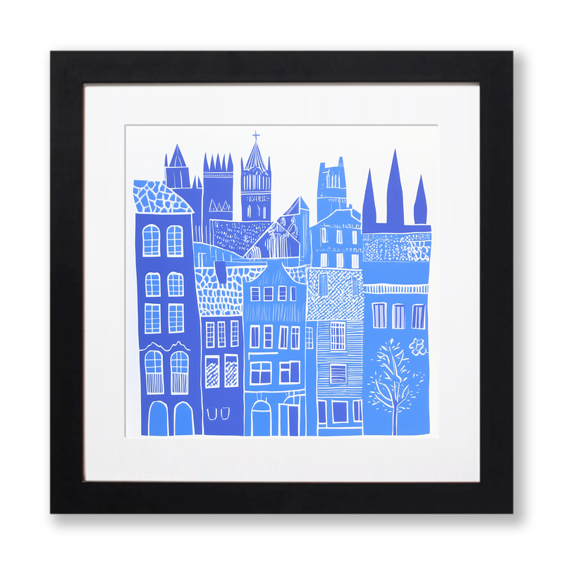 Explore the intricate charm of the Barcelona Gothic Quarter through this exquisite lino-print style artwork. This piece captures the essence of ancient streets and Gothic architecture, bringing to life the iconic spires and facades that define this historic area. Rendered in a captivating blend of blues and whites, the artwork showcases a harmonious mix of geometric shapes and intricate patterns that highlight the unique silhouettes of the buildings. The towering structures and detailed rooftops are beautifully juxtaposed with the simplistic trees and textured stonework, evoking the rustic beauty of Barcelona's architectural legacy. Perfect for art enthusiasts and lovers of urban landscapes, this print, available in both 36cm and 46cm squares, is elegantly framed in either black or white. Additionally, engage in your own artistic journey with the downloadable source images, line drawings, and sketches, ideal for creating personalised lino prints. Immerse yourself in the beauty of the Gothic Quarter and let this artwork add a touch of architectural elegance to your space.