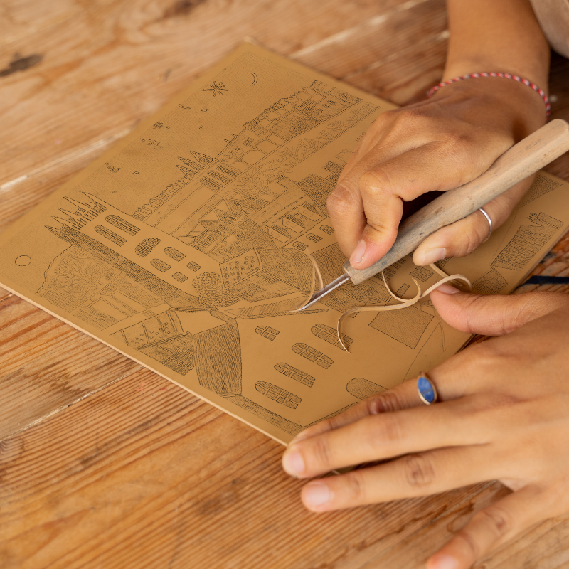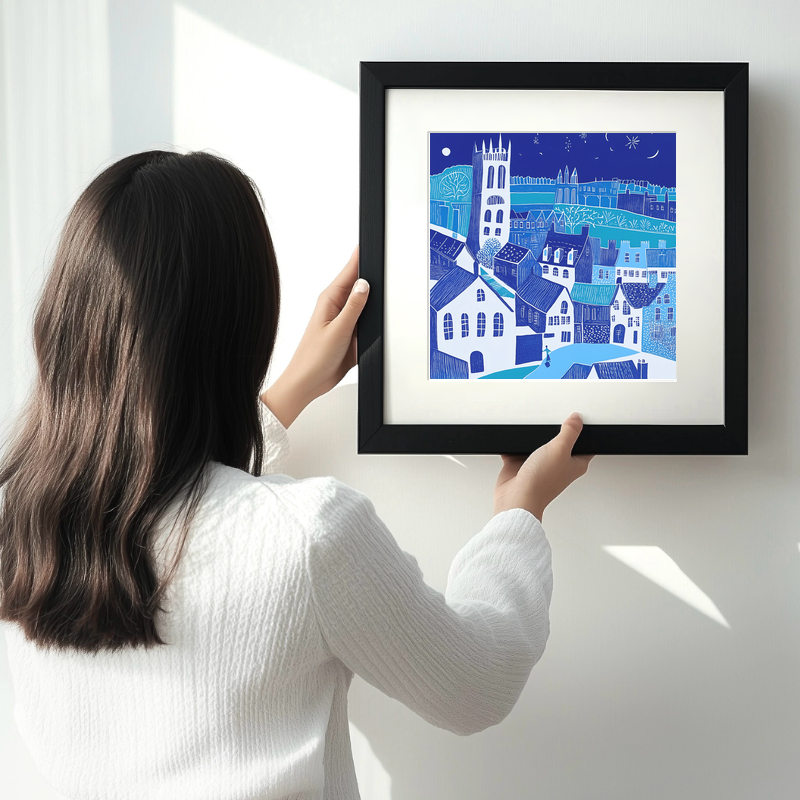This stunning lino-print style artwork captures the majestic beauty of Lincoln Cathedral, showcasing its iconic spires rising above a charming cityscape. The scene is depicted in a stylized manner, with a rich palette of blues and whites lending depth and contrast to the image. The cathedral is centered in the piece, surrounded by quaint houses, each with their own unique charm, characterized by bold, expressive lines. The night sky, dotted with stars and a crescent moon, adds an enchanting element to the composition. This artwork is available in a high-quality black or white frame, sized either 36cm or 46cm square, perfect for any home or office setting. Additionally, for those inspired by printmaking, the source images including line drawings and sketches are available for download, allowing you to embark on your own creative journey.