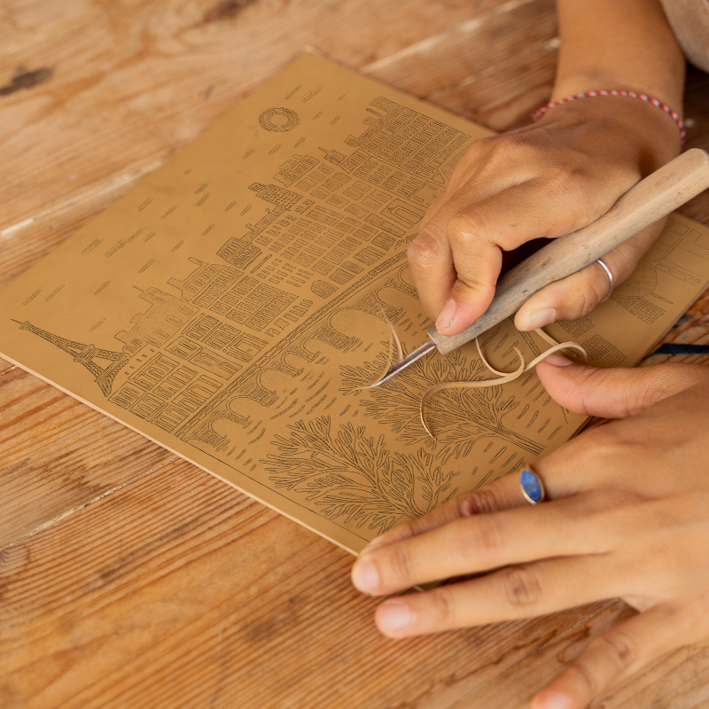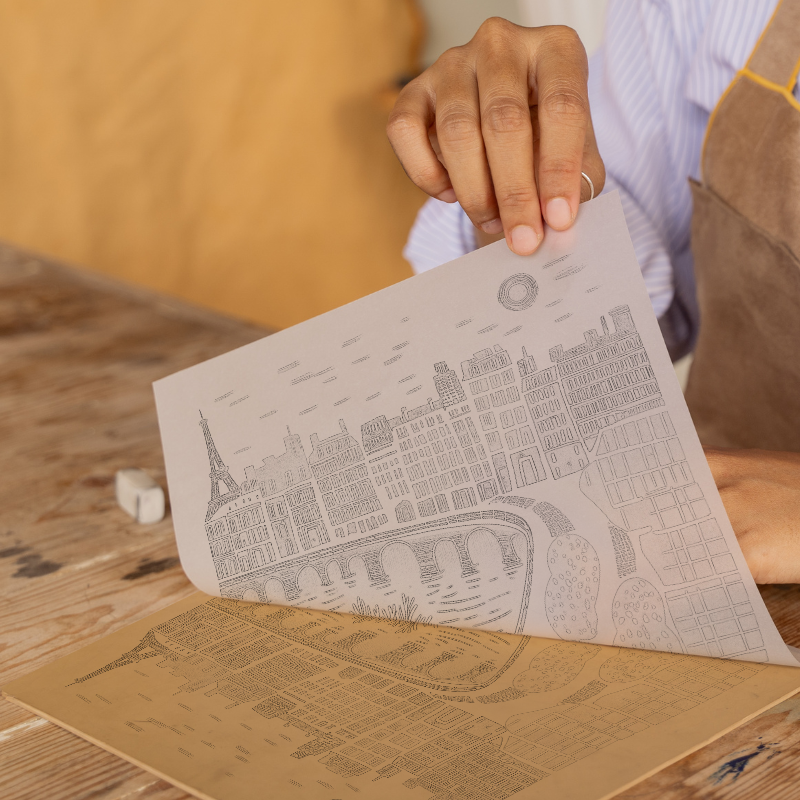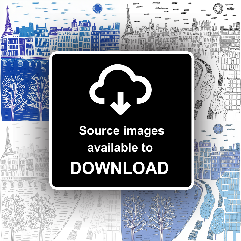 This captivating linocut-style artwork beautifully captures the Paris skyline, blending tradition and modernity with its striking blue tones and intricate details. The iconic Eiffel Tower stands proudly among the cityscape, framed by elegant Haussmannian buildings that line the tranquil Seine River. The winding pathways, lined with meticulously rendered trees, guide the viewer's eye through this vibrant depiction of the French capital. Floating clouds and a stylised sun add a whimsical touch to the scene, making it not only a visual treat but also an invitation to dream. Each piece is meticulously framed in either black or white, available in 36cm or 46cm squares, ensuring it perfectly complements any décor. Embrace the beauty of Paris with this stunning print or explore your creativity with downloadable source images to create your own masterpiece. Part of our exclusive "Architecture & Cityscapes" collection, this artwork is a timeless homage to one of the world’s most adored cities.