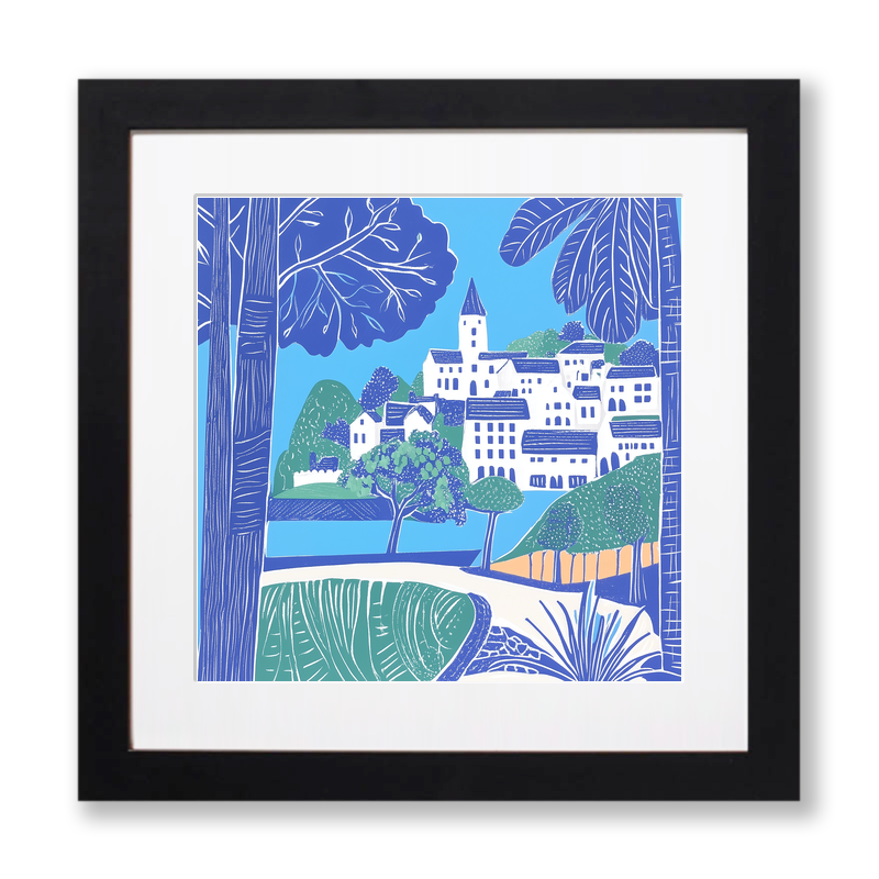 Bring the captivating beauty of Portmeirion Village into your home with this exquisite lino-print style artwork. Part of our acclaimed Architecture & Cityscapes collection, this piece wonderfully illustrates the enchanting charm of this iconic Welsh location. The artwork depicts the village nestled amidst lush greenery, with an array of charming white houses, captivating blue foliage, and architectural details including a striking church tower. The scene is framed by stylised trees and rolling hills, offering a tranquil and picturesque setting. The bold, crisp lines and vibrant hues, including shades of blue, green, and white, create a visually striking and unique representation of this magical place. Available in framed prints, with the option to choose black or white frames in 36cm or 46cm square sizes, this piece is perfect for art enthusiasts and those who cherish the charm of architecture. Unleash your creativity by downloading the source images and transform them into your own linocuts. Enhance your living space with this vibrant portrayal of Portmeirion Village.