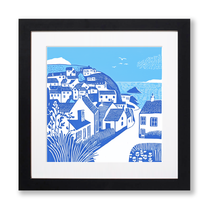 Capture the serene charm of Cornwall's coastal beauty with this stunning lino-print style artwork of Port Isaac. This piece evokes the quaint and picturesque essence of the village, with its tightly knit white cottages climbing a lush hill, overlooking the deep blue sea. The simplistic yet expressive strokes in vibrant blue and white bring out the essence of this tranquil locale, inviting viewers to lose themselves in its peaceful atmosphere. Each building and path is intricately detailed, revealing the artist's mastery in capturing the quaint charm of Cornish architecture. Available in professional black or white frames, this artwork comes in two sizes: 36cm square or 46cm square, perfect for any wall space. For the creative at heart, our unique offering allows you to download the source images, including line drawings and sketches, to craft your own lino print masterpiece. Enrich your home with a touch of Cornwall’s timeless beauty today.