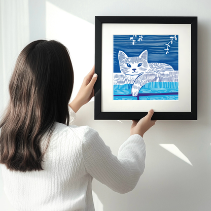 Our 'Cute Kitten' print captures the essence of playful curiosity, rendered in an enchanting lino-print style. This delightful artwork is part of our Cute Animals collection, showcasing a charming kitten resting comfortably, its wide, expressive eyes fixated on the viewer. Set against a stunning monochrome background, the kitten's intricate detailing is skillfully highlighted by the contrast between bold, thick lines and subtle, delicate strokes. Leaves dangle gracefully from above, adding a touch of elegance and reminding us of the tranquil moments in nature. Offered in both 36cm and 46cm square formats, each print is meticulously framed in your choice of a sophisticated black or a classic white frame, ensuring it complements any decor style. For the creative at heart, we provide the exclusive option to download the line drawings and sketches of this piece, empowering you to craft your own lino print masterpiece.