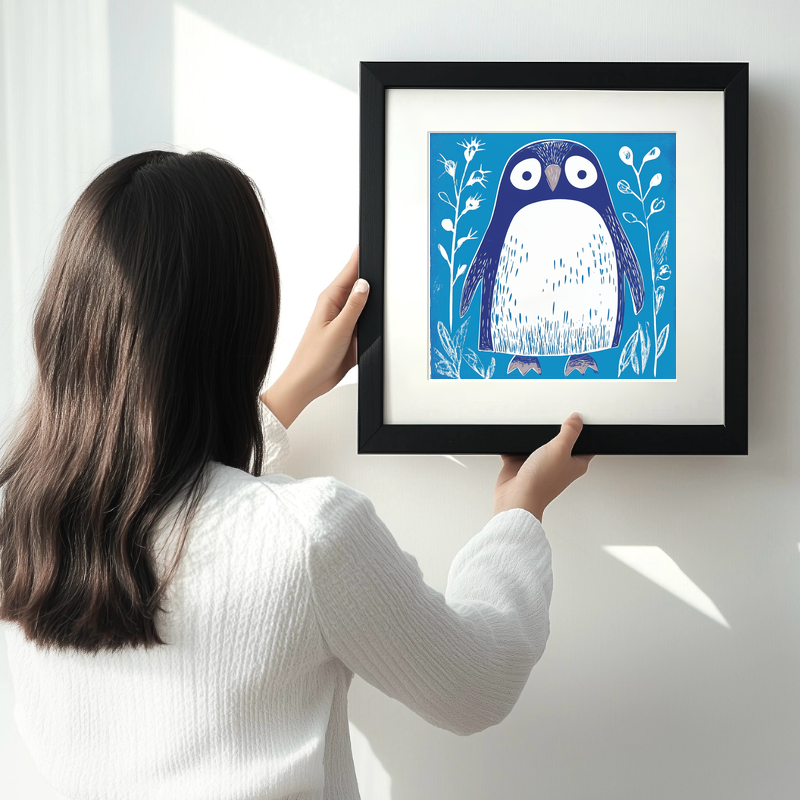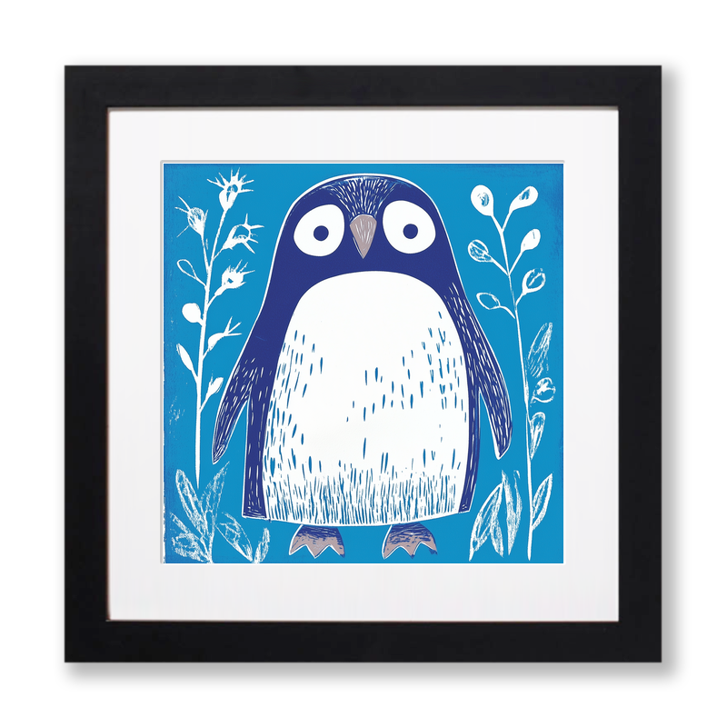 This charming artwork features an adorable penguin chick in a distinctive lino-print style. The piece is part of our beloved Cute Animals collection, designed to bring a playful and heartwarming touch to your space. The penguin is outlined in a bold blue against a vibrant teal background, with white detailing highlighting its fluffy appearance. Delicate white foliage flanks the penguin, adding a touch of whimsy and balance to the piece. Each print is available in a sleek black or white square frame, either 36cm or 46cm, ideal for any space in your home or office. For those feeling creative, we offer an exclusive option to download the source images, including line drawings and sketches, allowing you to craft your own lino print at home. Experience the joy of this quirky creature, perfectly capturing its innocent charm and playful nature.