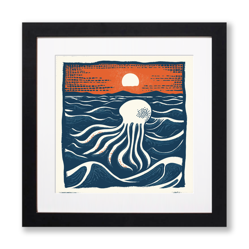 Explore the tranquil beauty of the deep sea with our exquisite lino-print style artwork, 'Jellyfish in Deep Water', part of our Nature & Wildlife collection. This piece captures a serene jellyfish gracefully drifting amidst flowing ocean waves. The artwork's bold, simplistic lines highlight the majestic movement of the jellyfish, creating a harmonious blend between the fluid lines and the serene underwater scenery. A setting sun casts a warm, orange glow across the horizon, contrasting beautifully against the deep blues of the sea. Shadows and patterns are meticulously crafted to enhance the jellyfish's soft, translucent form, bringing to life the peaceful ambiance of the ocean. This print is available in a choice of black or white frames and two sizes, 36cm or 46cm square. Additionally, customers can access the source images, including line drawings and sketches, perfect for those inspired to create their own lino prints.