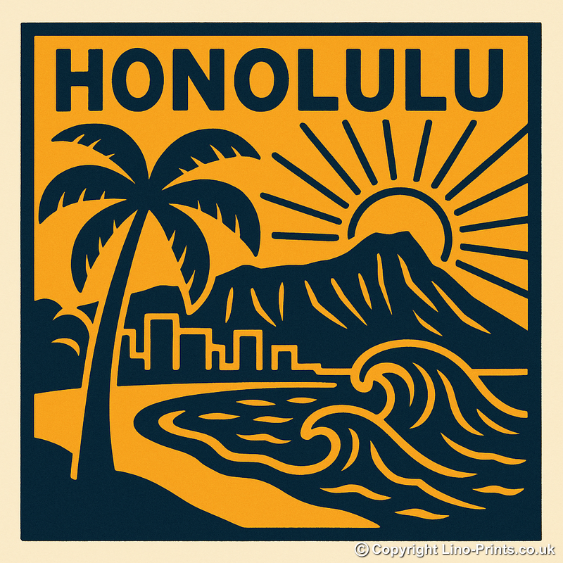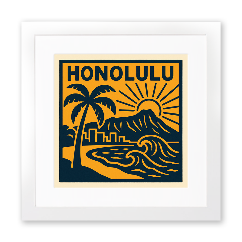 Celebrate the vibrant spirit of Honolulu with this striking lino-print style artwork from our Travel Posters collection. Available in your choice of black or white frame and in 36cm or 46cm square sizing, this framed print brings a fresh and artistic touch to any space. The image captures the essence of Hawaii’s iconic capital: a bold palm tree frames the foreground, evoking swaying coastal breezes, while geometric city buildings rest against the foot of the legendary Diamond Head volcanic cone. Radiant sunbeams stretch over the peak, suggesting warmth and energy, while stylised ocean waves lap ashore, conjuring the allure of Honolulu’s world-famous beaches.