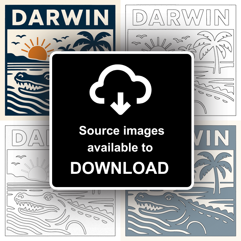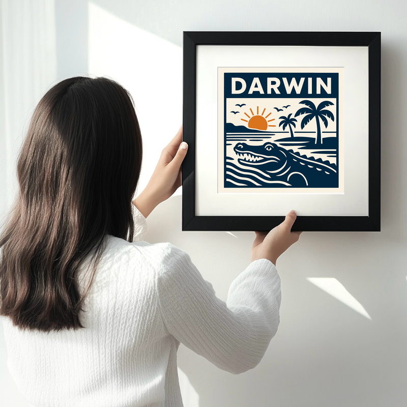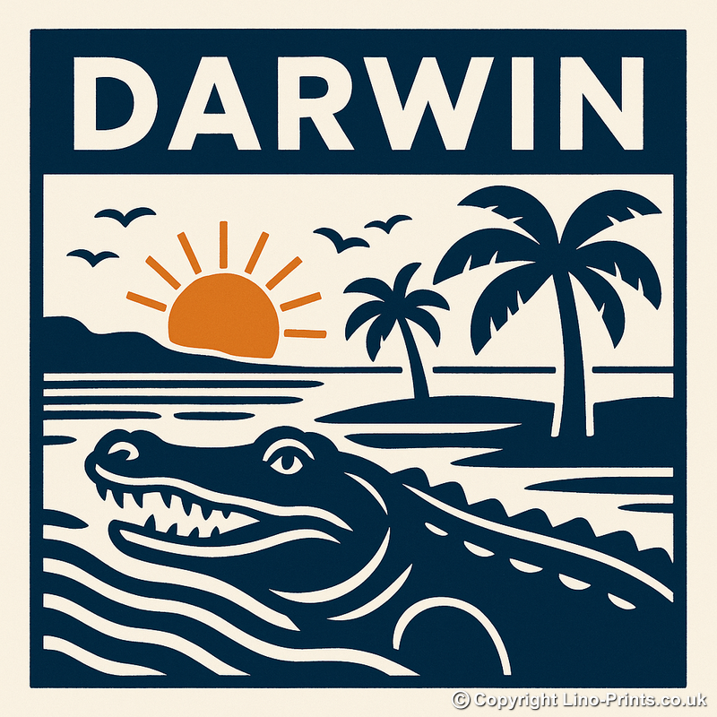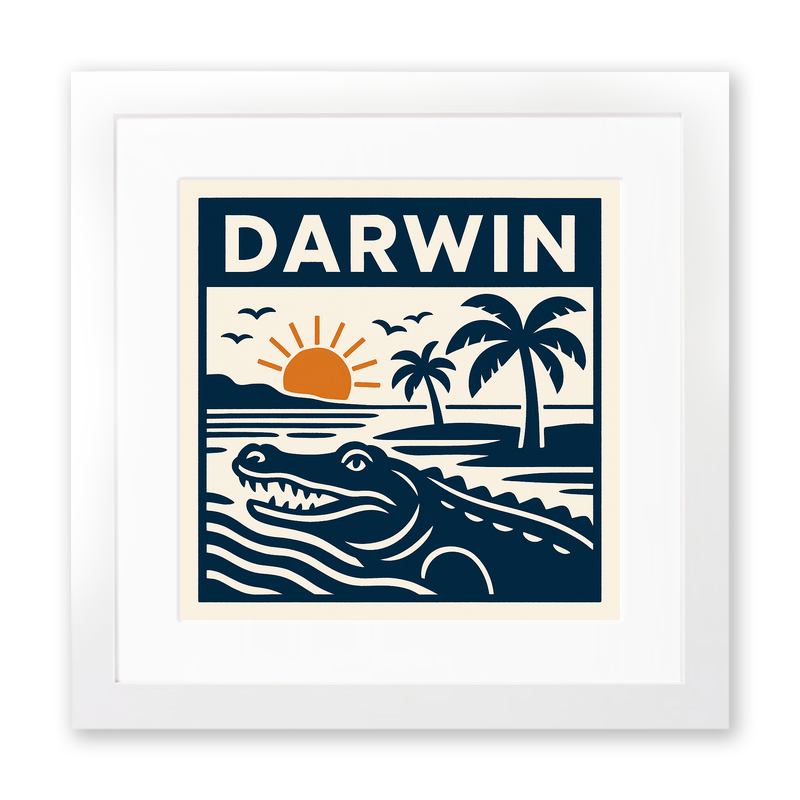 Celebrate the spirit of adventure and tropical beauty with this charming lino-print style framed artwork, featuring the vibrant city of Darwin. Part of our exclusive Travel Posters collection, this piece elegantly depicts a crocodile gliding through serene waters set against a backdrop of swaying palm trees and a glowing sunset. Crisp, stylised lines in deep navy blue create a bold, graphic effect, complemented by earthy orange highlights that capture the warmth of the Northern Territory’s iconic sunsets. Overhead, a flock of birds adds movement to the tranquil scene, creating a sense of wild, untouched nature. The city’s name, 'Darwin,' is proudly displayed at the top in striking block letters, making this print a stunning homage to one of Australia’s most unique destinations.
