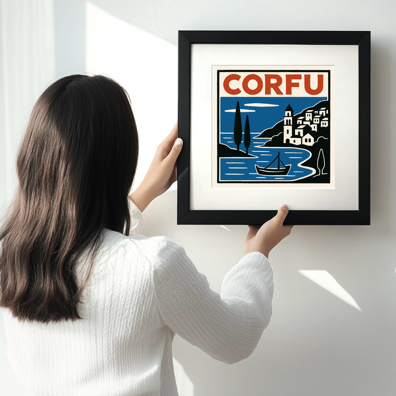 Bring the charm of the Mediterranean into your home with our lino-print style Corfu travel poster, part of our exclusive 'Cities' collection. This eye-catching artwork captures the timeless elegance of Corfu, one of Greece’s most beloved islands. The print features a beautifully stylised coastal scene: the calm blue sea frames a classic fishing boat in the foreground, while bold cypress trees and iconic whitewashed buildings cascade down a hillside towards the water. The skyline boasts a picturesque church with a domed bell tower, evoking the region’s rich heritage. Bright, flat colours and crisp lines in blue, black, and white provide a classic, vintage feel reminiscent of mid-20th century travel posters. The word 'CORFU' sits proudly at the top in striking red, instantly drawing the eye and celebrating your love for this spectacular destination.