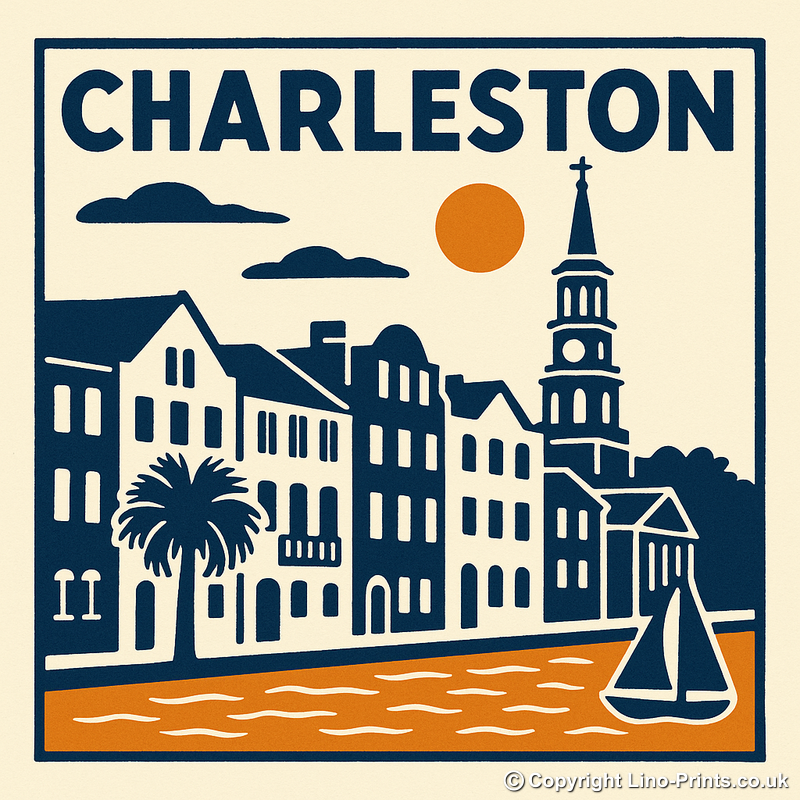 Bring the timeless charm of Charleston into your space with this striking lino-print style artwork, part of our Travel Posters collection. This piece captures the iconic skyline of Charleston, with classic Georgian façades, a distinctive church steeple, and the beauty of the waterfront. A charming sailboat glides along the coppery river, while a bold palm tree hints at the city's Southern warmth. The sun, rendered in a deep burnt orange, sets over the horizon, contrasting beautifully against the dramatic navy blue of the clouds and cityscape. Each detail is defined by strong, simplified lines, channelling the tactile quality of traditional linocut prints and evoking the nostalgia of vintage travel posters.