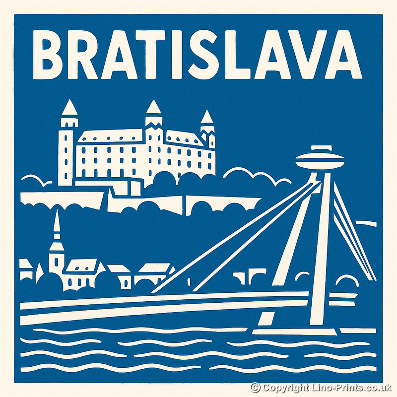 Celebrate the charm of Slovakia's capital with our Bratislava lino-print style artwork, a distinguished piece from our Travel Posters collection. This striking print captures the essence of the city through its iconic landmarks, including Bratislava Castle perched atop a hill, the timeless Old Town silhouettes, and the instantly recognisable UFO Bridge spanning the Danube. The composition is beautifully rendered in a two-tone blue and cream palette, evoking the clean, bold lines and rich tradition of lino printmaking. The architectural forms and softly undulating river create a harmonious blend of history and modernity. Each piece is meticulously framed in your choice of black or white, and comes in two square sizes—36cm or 46cm—suiting any wall space. For creative adventurers, we proudly offer an exclusive digital download: receive the source files, including detailed line drawings and sketches, and try your hand at creating your own hand-crafted lino print at home. Perfect for lovers of travel, European cities, and graphic art, this print makes a thoughtful gift or stunning centrepiece for your own home.