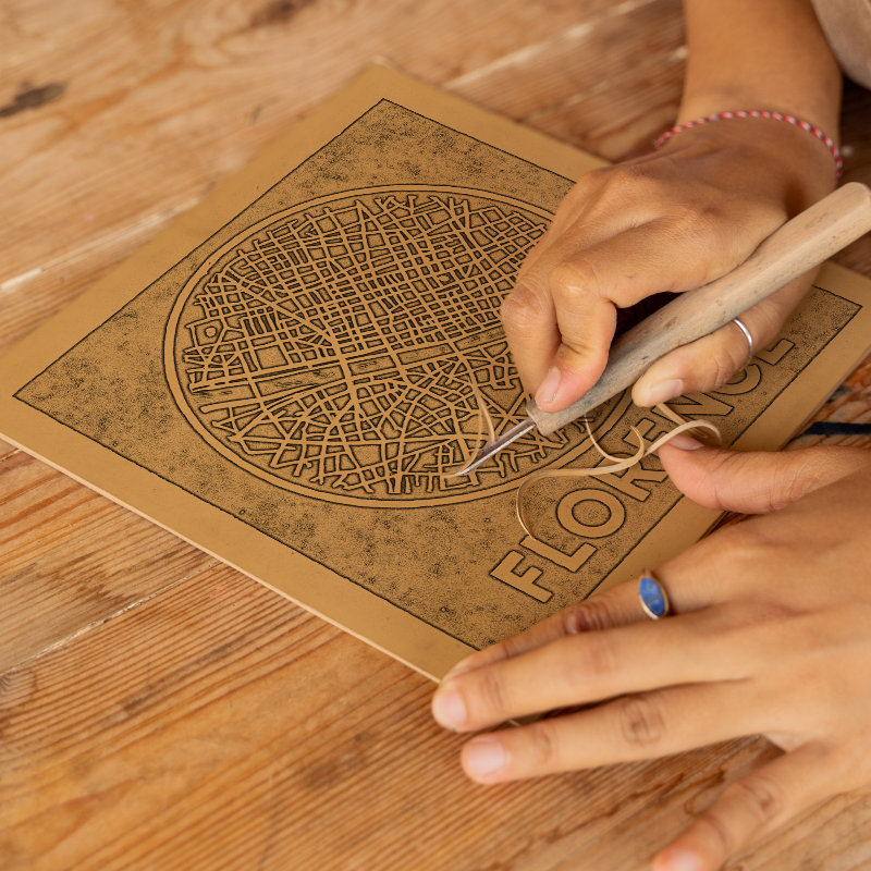 Beneath the map, the city's name 'FLORENCE' stands boldly in capital letters, its hand-carved appearance adding a charming artisanal touch. Each line and curve of the artwork recalls the hands-on process of lino printing, making the piece truly special for lovers of travel, art, and Italian culture alike.