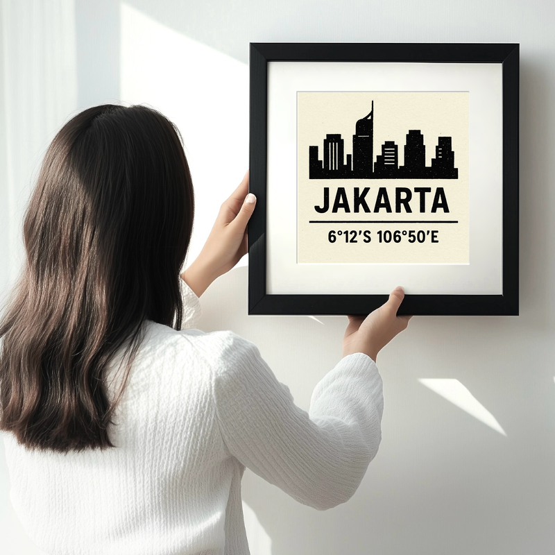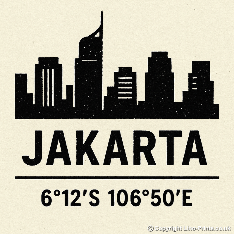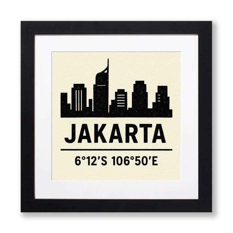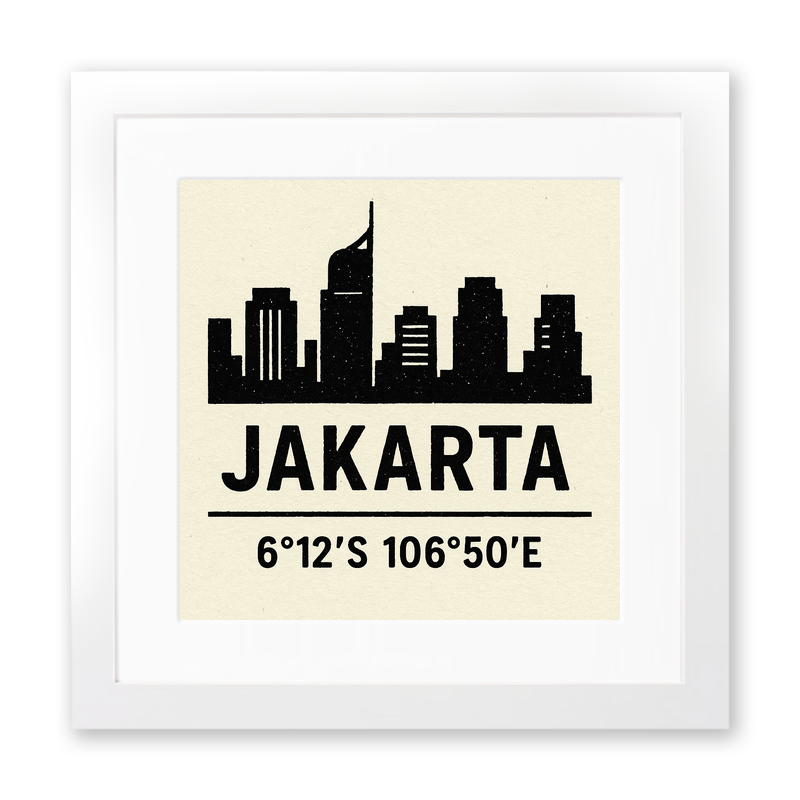 Celebrate the vibrant spirit of Indonesia’s capital with our Jakarta lino-print style artwork, featured in our exclusive Travel Posters collection. This standout piece captures the dynamic silhouette of Jakarta’s skyline, using the bold, graphic lines characteristic of linocut craft. Rendered in striking black on a subtly textured off-white background, the image features a stunning array of distinctive skyscrapers, including the iconic Wisma 46 building that pierces the cityscape with its unique spire. The clean, minimalist lines create a timeless aesthetic that fits seamlessly into modern or classic interiors. Beneath the skyline, bold typography spells out 'JAKARTA', while precision coordinates (6°12'S 106°50'E) mark the location, giving the piece a chic, globetrotter’s vibe ideal for travel lovers or city enthusiasts.