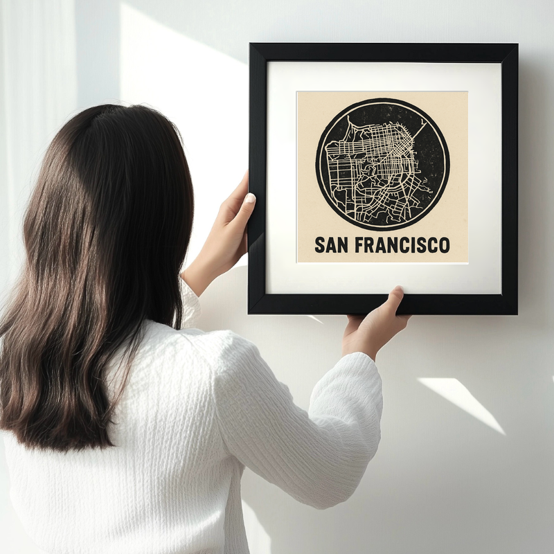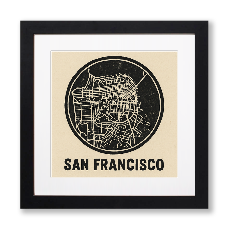 Celebrate the iconic streets and spirit of the Golden Gate City with this striking lino-print style artwork of San Francisco, part of our exclusive Travel Posters collection. This contemporary piece features a detailed map of San Francisco rendered in bold, expressive lino-print lines. The map sits confidently within a deep black circle, showcasing the city's famed grids and winding routes in minimalist cream against a rich black backdrop. Beneath the map, ‘San Francisco’ is boldly printed in classic type, emphasising the city's vibrant personality. The textured, slightly uneven lines and ink tones evoke the handcrafted charm of traditional lino printing, offering both a timeless and modern feel. Available expertly framed in either black or white, in your choice of 36cm or 46cm square, this print makes an eye-catching statement in any home, office, or creative space. For artists and crafters, a unique option is available: download the full set of source images, including line drawings and preliminary sketches, to create your own version or inspire a bespoke lino-cut project. Whether you’re a lover of travel, a fan of maps, or searching for a unique San Francisco gift, this artwork is sure to inspire wanderlust and creativity.