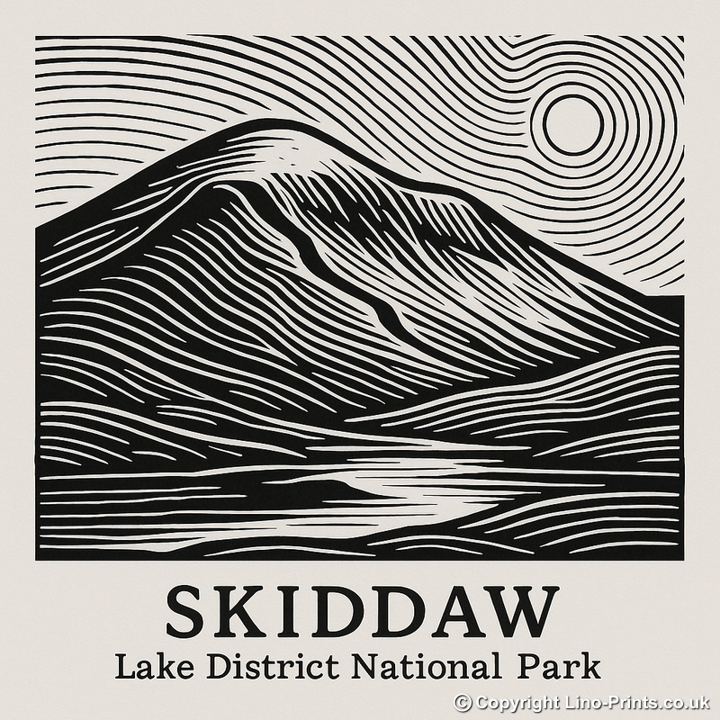 Bring the dramatic beauty of the Lake District into your home with this striking lino-print style artwork of Skiddaw, one of Cumbria’s most iconic peaks. Expertly rendered in bold black and white, this piece captures the mountain’s imposing slopes and the peaceful valleys below, all under a radiant stylised sun. The clean lines and textured detailing reflect the traditional linocut technique, with sweeping curves suggesting dynamic movement in the sky and landscape. Perfect for lovers of the outdoors, hikers, or anyone who holds the Lake District close to their heart, this print is available framed in either classic black or white, and in two sizes: 36cm or 46cm square, making it ideal for any space.