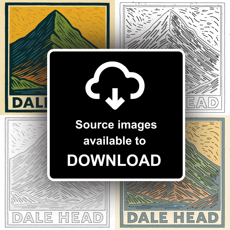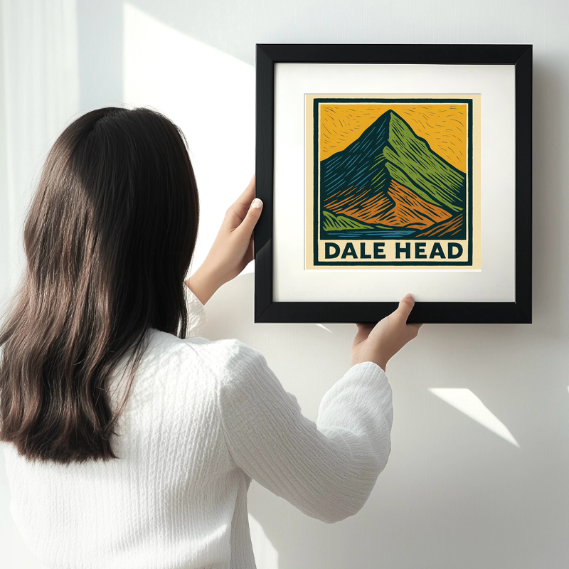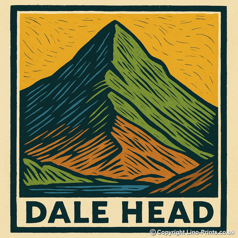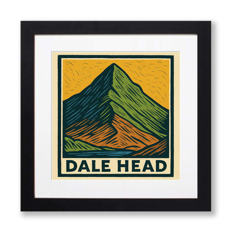Celebrate the rugged beauty of the Lake District with this striking lino-print style artwork of Dale Head. Expertly designed to evoke the tactile charm of traditional lino cut prints, this piece captures the majestic silhouette of Dale Head’s peak under a warm ochre sky. Bold, angular lines define the dramatic slopes, combining deep forest greens with earthy ochres and rusts to recreate the changing light over the fells. The foreground details the rich contouring of the landscape, leading the viewer's eye towards a tranquil blue tarn at the mountain's base. Set within a solid border and finished with the name 'Dale Head' in a classic, hand-printed typeface, this artwork is both a tribute to the area's heritage and a contemporary piece for any home.