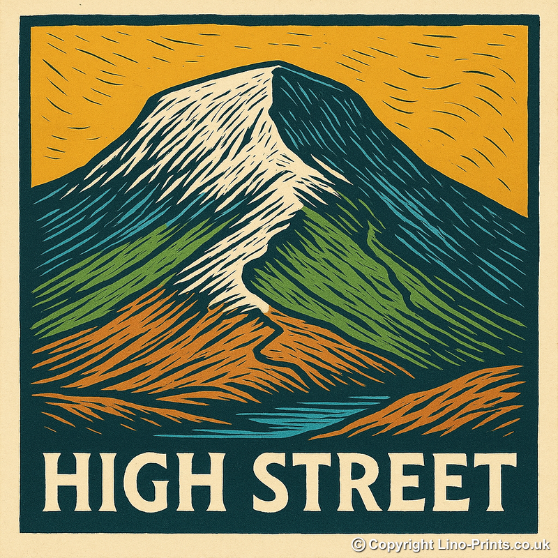Bring a striking piece of the Lake District into your home with this beautifully crafted lino-print style artwork, depicting the iconic High Street mountain. This design captures the majesty of High Street with bold, expressive lines and a palette that evokes the rugged beauty of the fells. The mountain rises powerfully under a vivid golden sky, its snowy summit rendered in crisp, angular strokes. Rolling green slopes give way to rich, earthy browns in the foreground, hinting at the moorland surrounding the peak. A shimmering hint of blue suggests a mountain tarn, enhancing the sense of natural grandeur. This artwork is expertly framed in your choice of black or white, and available in either 36cm or 46cm square, making it perfect for any home or workspace. For creatives, we offer a unique option to purchase and download the source images. Get access to the original sketches and line drawings, ideal for crafting your very own lino print inspired by this famous Cumbrian landmark. Whether as a thoughtful gift or an eye-catching addition to your décor, this piece celebrates Britain’s most beloved landscapes with bold style and artisanal charm.