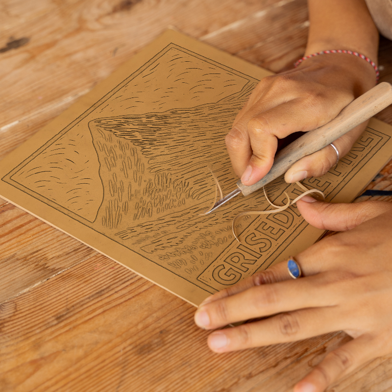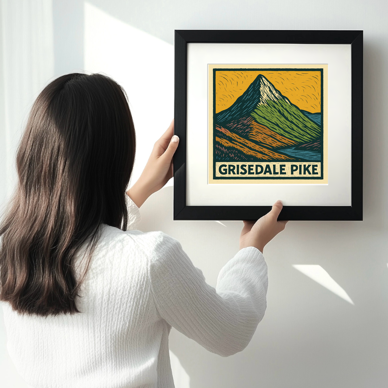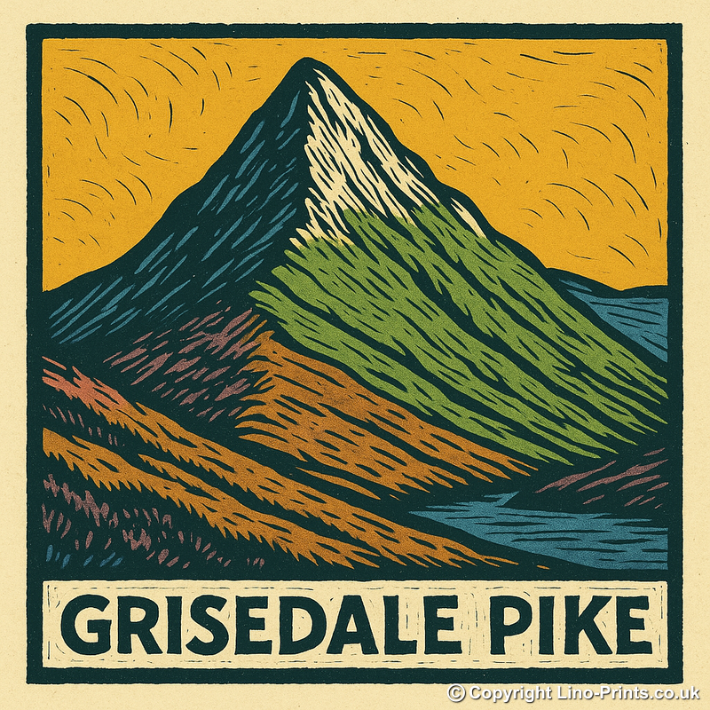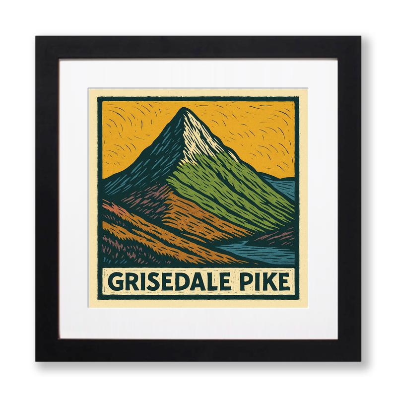 Celebrate the majesty of the Lake District with this striking lino-print style artwork featuring Grisedale Pike. This beautifully detailed print captures the iconic mountain's sharp summit and bold ridgelines, rising above the rolling fells below. The bold block shading and expressive marks evoke traditional lino-cut techniques, giving the artwork a handcrafted and textural feel. The warming ochre sky sets off the deep greens and earthy browns of the mountain’s slopes, creating a dynamic contrast that brings the scene to life. Subtle blue tones suggest a distant lake or valley, adding depth to the composition. Framed in your choice of classic black or white, and available in both 36cm and 46cm square formats, this piece makes a captivating statement on any wall. For creative souls, we offer the unique option to download the original source images, including line drawings and preparatory sketches, so you can create your very own lino print inspired by the Lake District. Whether you’re a lover of mountains, an adventure seeker, or simply looking to add a touch of nature’s drama to your home, this Grisedale Pike print is a timeless celebration of one of Cumbria’s most beloved landscapes.