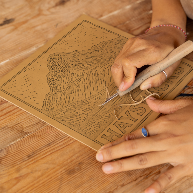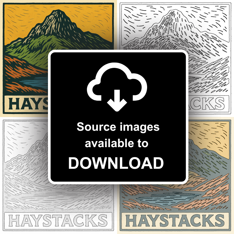Bring the rugged beauty of the Lake District into your home with this striking lino-print style artwork depicting the iconic Haystacks mountain. This piece captures the dramatic silhouette of Haystacks rising proudly above the serene, blue waters and russet slopes of the surrounding landscape. The stylised composition uses bold lines and vivid blocks of colour to evoke the timeless character of traditional hand-carved lino prints. The foreground features earthy terracotta and ochre tones, seamlessly blending into deep green hillsides and a majestic, dark mountain peak that commands attention. Above, a rich golden sky is rendered with expressive, swirling strokes, suggesting the ever-changing light typical of the Lake District. Finished with the mountain's name in bold type, this artwork is a celebration of one of Cumbria’s most beloved fells. Perfect as a gift for hillwalkers, nature lovers, and fans of British landscapes, this print is available framed in classic black or white, in either 36cm or 46cm square sizes. For creatives, we offer an exclusive digital download of the original linework and sketches, so you can craft your own lino print masterpiece at home. Elevate your space with the spirit of adventure and wild places, bringing the outdoors in.