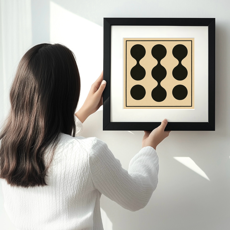 Celebrate the enduring influence of Bauhaus design with this striking lino-print style artwork, offered exclusively as part of our Bauhaus collection. Presented in a crisp black or white frame, with your choice of 36cm or 46cm square sizes, this piece brings a bold sense of geometry and modern sophistication to any space. The print features a grid of abstract black shapes, balanced inside a fine-lined square border. Each form is reminiscent of interlocking circles and hourglass silhouettes, creating a sense of harmony and rhythm characteristic of Bauhaus ideals. The minimalist palette of deep black against a warm, natural beige background enhances the play of positive and negative space, making this piece a standout addition to contemporary interiors, studios, or creative workspaces.