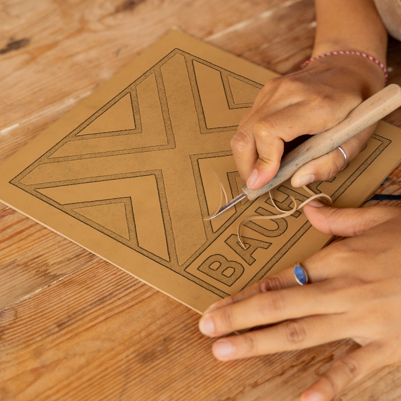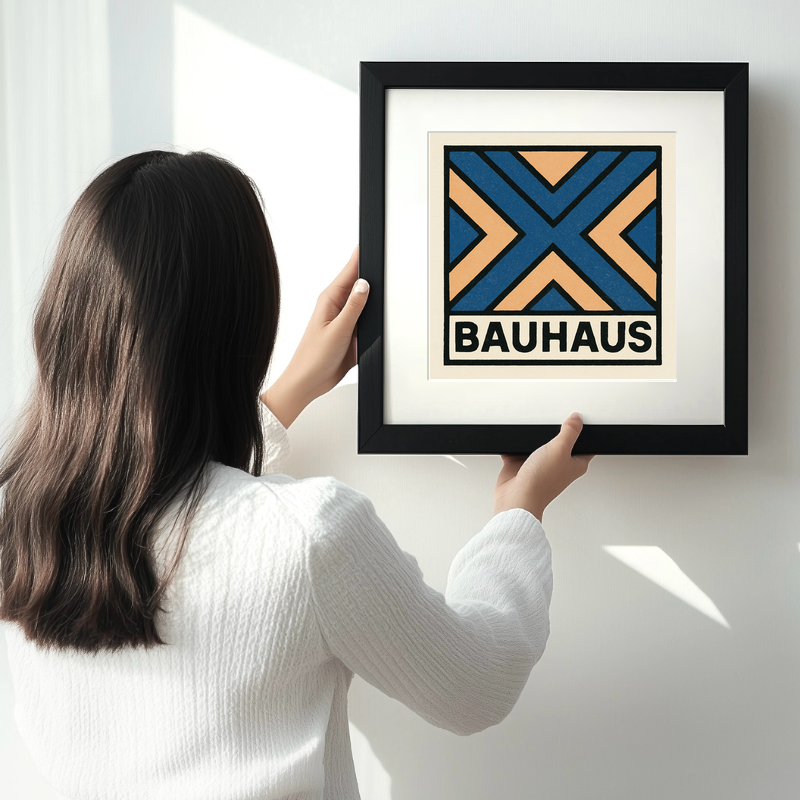 Celebrate the bold simplicity of Bauhaus design with this striking lino-print style artwork from our Bauhaus collection. The central feature of this piece is a series of intersecting chevrons and triangles rendered in strong geometric forms, all contained within a perfectly balanced square. The artwork prominently displays the word 'BAUHAUS' in thick, modernist sans-serif typography at the base of the design, anchoring the composition and reinforcing its Bauhaus heritage.