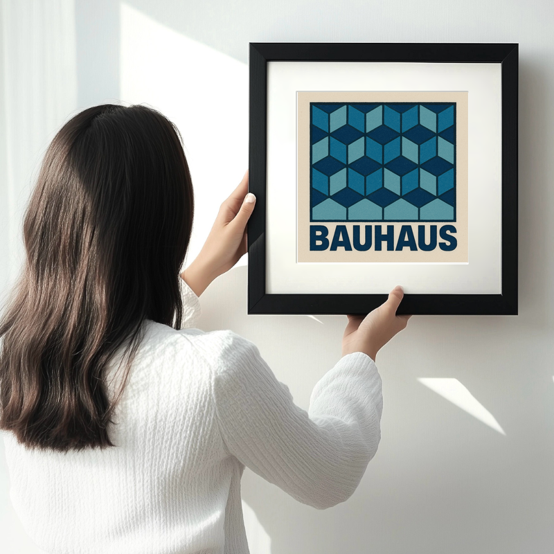 This striking lino-print style artwork pays homage to the timeless Bauhaus movement, celebrated for its balance of form and function. Carefully crafted with bold geometric shapes, the print features an eye-catching tessellation of cubes in alternating deep navy and soft teal, creating a three-dimensional optical illusion that draws the eye. The clean, minimalist lines are set against a neutral, off-white background, enhancing the modernist aesthetic. Beneath the geometric pattern, the word 'BAUHAUS' is rendered in a strong, sans-serif typeface, echoing the design philosophies of clarity and simplicity that the Bauhaus is famed for. Perfect for lovers of modern art and interior design, this piece evokes a sense of structure, harmony, and innovative creativity.