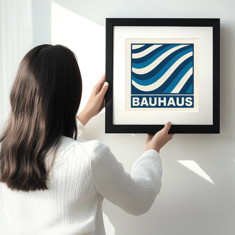 Celebrate the timeless elegance of modernism with this striking lino-print style artwork from our Bauhaus collection. Fusing geometric form with a rhythmic sense of movement, the design features bold, flowing blue and off-white waves arranged within a square border. The organic undulations evoke both the functional artistry and disciplined aesthetics of the Bauhaus movement, making this print a perfect statement piece for contemporary and minimalist interiors alike. Underneath the geometric composition, the bold, all-caps "BAUHAUS" lettering grounds the piece with unmistakable clarity, encapsulating the artwork’s architectural influence. The hand-carved texture, visible in the wavering lines and subtle surface markings, pays homage to traditional printmaking techniques, imparting authenticity and tactile character that digital artwork often lacks. Available expertly framed in chic black or crisp white, and in your choice of 36cm or 46cm square – ideal for creating a focal point or enhancing a gallery wall. For makers and art-lovers, a unique downloadable option provides the original source images, including detailed line drawings and sketches, so you can craft your own lino print at home. This design not only captures the iconic style of Bauhaus but also invites creativity, making it a versatile addition to your home or studio.
