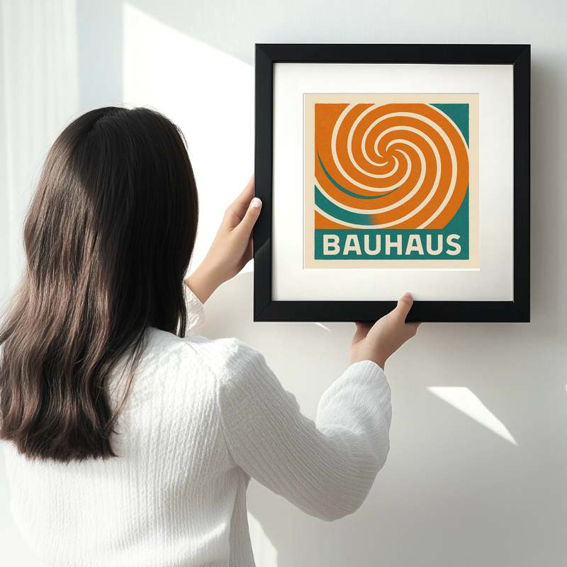 Celebrate the timeless spirit of modernist design with this striking Bauhaus lino-print style artwork. The piece features a bold, swirling spiral radiating from the centre, rendered in a vibrant burnt orange tone against a calming teal background. Clean, geometric lines and a balanced composition echo the hallmark aesthetics of the Bauhaus movement, marrying art with functionality in true minimalist style. The swirling motif suggests movement and dynamism, making it a stand-out feature for any contemporary interior. Bold 'BAUHAUS' lettering in crisp cream anchors the design, offering both a homage to historic avant-garde design and a stylish decor statement. Each print is lovingly produced to emulate the tactile textures of traditional lino printing, and is available framed in your choice of black or white, with 36cm or 46cm square options for versatile display. As an exclusive touch, you can purchase digital source files, including the line drawings and initial sketches for this piece—perfect for crafting your own lino print at home and delving into the creative process. Whether as a classic wall feature or a hands-on art project, this Bauhaus-inspired work brings bold colour, form, and heritage to your living space.