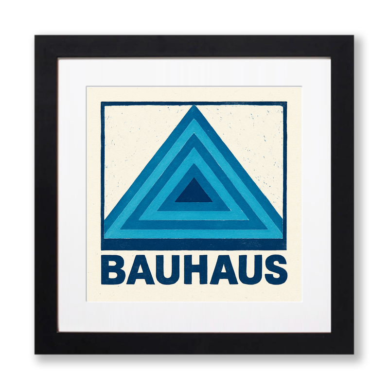 Celebrate the timeless elegance and bold simplicity of Bauhaus in your home with this striking lino-print style artwork. The design features a series of nested equilateral triangles in varying shades of rich blue, radiating outward and creating a captivating geometric focal point. Rendered with classic lino-print texture, subtle grain, and softly imperfect edges, each triangle has a hand-crafted feel that is both tactile and visually engaging. The word 'BAUHAUS' is displayed in bold, sans-serif capital letters beneath the triangles, reinforcing the iconic Bauhaus aesthetic. Set against an off-white/cream background and enclosed within a hand-drawn square border, this piece exudes the clarity, function, and artistry that define the Bauhaus movement. Available in both 36cm and 46cm square formats, and your choice of black or white frame to complement any modern or minimalist decor. For art enthusiasts and creative spirits, we also offer a unique downloadable bundle containing the source images, including line drawings and original sketches, enabling you to create your very own lino print inspired by this masterpiece. Bring a touch of modernist history and creative inspiration into your space with this exclusive art print from our Bauhaus collection.