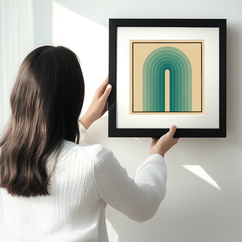 Immerse yourself in the timeless elegance of Bauhaus design with this stunning lino-print style artwork from our exclusive Bauhaus Collection. This piece features bold geometric simplicity, perfect for lovers of modernist art and graphic minimalism. The image presents a series of concentric arch shapes, expertly rendered in clean, even lines. The arches progress from a rich teal at the centre to a lighter turquoise as they expand outward, creating a hypnotic sense of movement and depth. The lines are crisp and evenly spaced, evoking the principles of precision and clarity inherent to the Bauhaus movement.