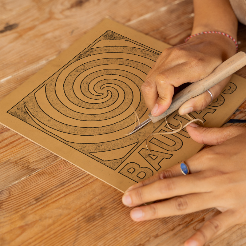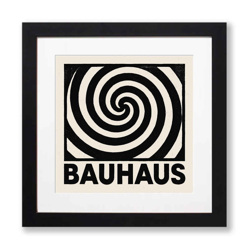 This striking piece from our Bauhaus collection pays homage to the revolutionary design principles of the Bauhaus movement. Presented in the distinctive style of a lino cut print, this artwork features a hypnotic spiral—bold, geometric, and mesmerising—that draws the eye inward. The spiral is meticulously rendered in high-contrast black and off-white, set within a thick square border that showcases the tactile, textured effect characteristic of lino-print making. The word 'BAUHAUS' is boldly set beneath the main image in a classic, modern sans-serif font, reinforcing the artwork’s direct link to Bauhaus typographic tradition and clean design ethos.