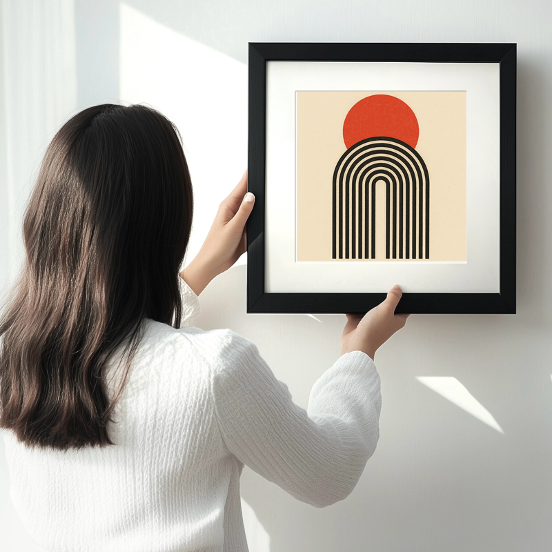 Bring the spirit of modernist minimalism into your home with this striking Bauhaus-inspired lino-print artwork. The composition is a celebration of geometric harmony and bold contrasts, characteristic of the Bauhaus movement. An arch-like form, made from a series of evenly spaced, black parallel lines, rises symmetrically from the base of the print. The rich black curves create a sense of rhythmic movement as they echo upwards. Above this architectural form, a vivid, solid red circle sits prominently, partially overlapping with the arch, evoking both the warmth of the sun and the geometric abstraction beloved by Bauhaus designers. The background is a warm off-white, providing a soft canvas that allows the red and black elements to stand out. The print exhibits a lightly textured finish, reminiscent of traditional hand-pulled lino prints, giving it an organic and tactile quality.