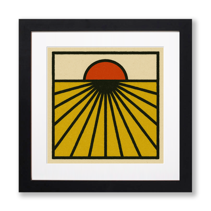 Bring timeless modernity into your home with this striking Bauhaus-inspired lino-print style artwork. Embracing the spirit of early 20th-century design, this piece captures the harmony of form and function. The artwork presents a bold, graphic depiction of a rising sun: a deep red semicircle breaking over a horizon, radiating dynamic black lines across a golden yellow field, all set within a strong black frame. The balanced geometry and harmonious colour palette evoke a sense of optimism, clarity, and creative innovation central to Bauhaus philosophy. The clean lines and clear contrasts make this print a perfect statement piece for contemporary interiors, study spaces, or creative studios. Each print is available framed in your choice of classic black or crisp white, and in two generous sizes – 36cm or 46cm square – to suit your decor. For aspiring printmakers, we also provide a unique downloadable package including the original source image, precise line drawing, and preliminary sketches, so you can create your own lino print from our Bauhaus collection at home. This versatile piece blends nostalgia with a modern edge, making it an ideal gift or collectible for any admirer of design history.