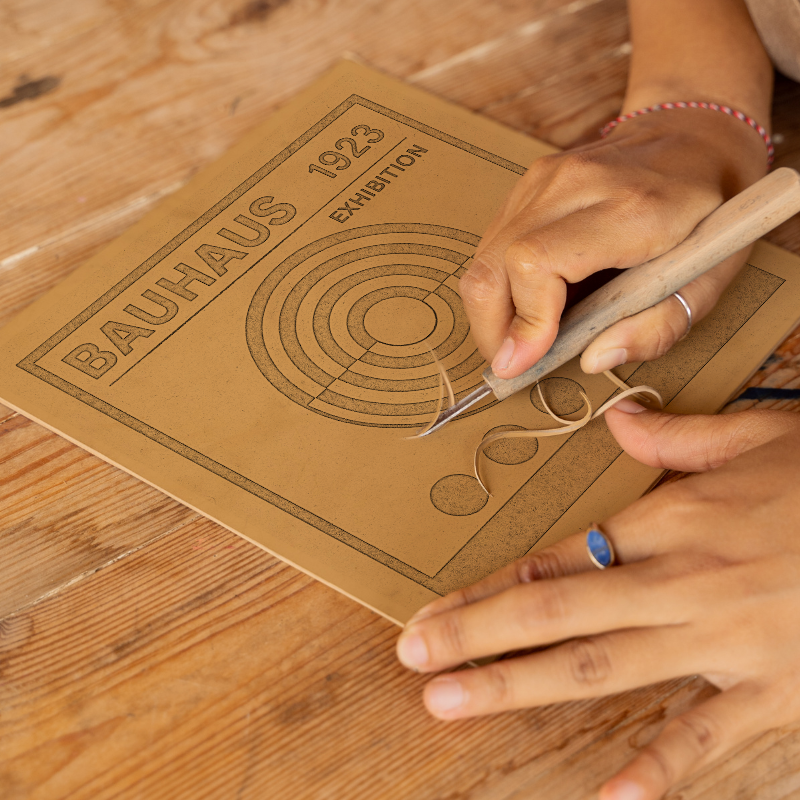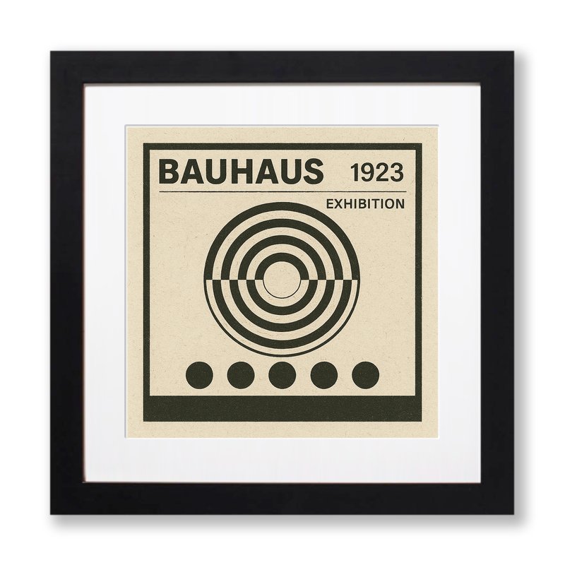 Celebrate the timeless influence of Bauhaus with this striking lino-print style artwork, inspired by the bold graphic statements of the 1923 Bauhaus Exhibition. The design features a geometric composition dominated by concentric circles intersected by a crisp horizontal axis, evoking the harmonious balance that is a hallmark of Bauhaus design. Five solid black circles anchor the lower portion of the print, echoing the mathematical precision and repetition found in modernist art. The upper section boldly proclaims 'BAUHAUS 1923 EXHIBITION' in clean, sans-serif typography, perfectly framed within a pronounced black border. Printed on a textured beige background reminiscent of classic printmaking paper, this piece embodies both history and modern minimalism. Available professionally framed in your choice of black or white and in two sizes, 36cm or 46cm square, it is a versatile addition to any interior hoping to channel the spirit of functional beauty and artistic experimentation. For creative enthusiasts, we offer downloadable source files including line drawings and sketches, empowering you to craft your own lino print and engage closely with Bauhaus principles. This is a perfect gift or statement piece for any admirer of design history, abstract art, or contemporary interiors.