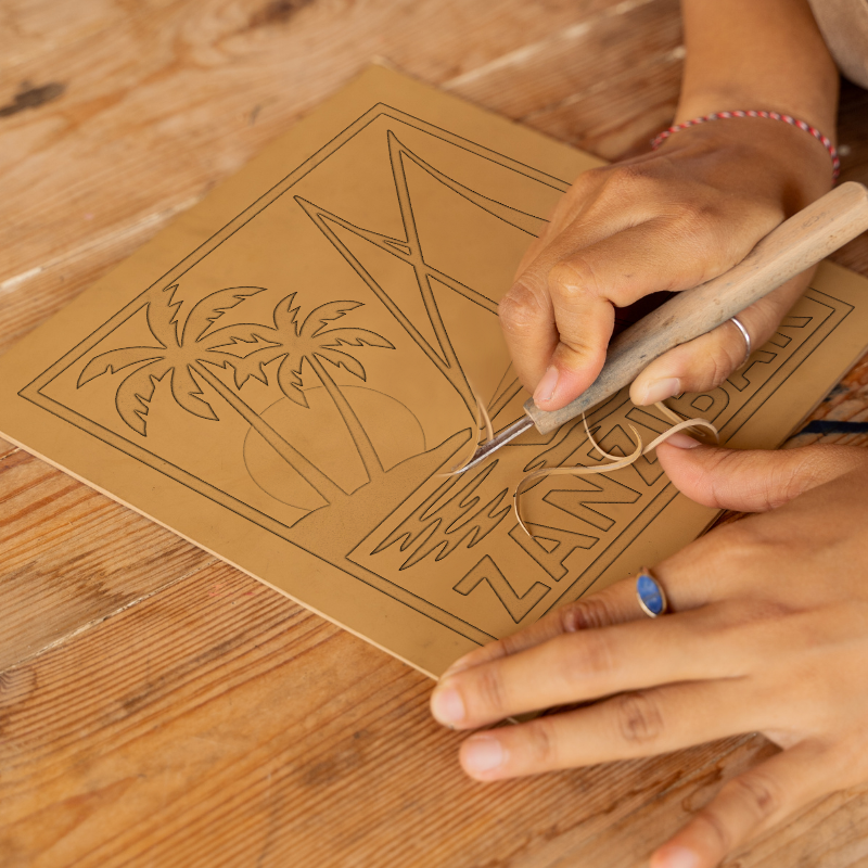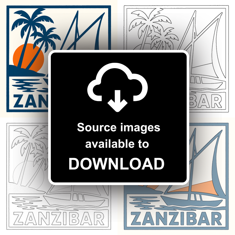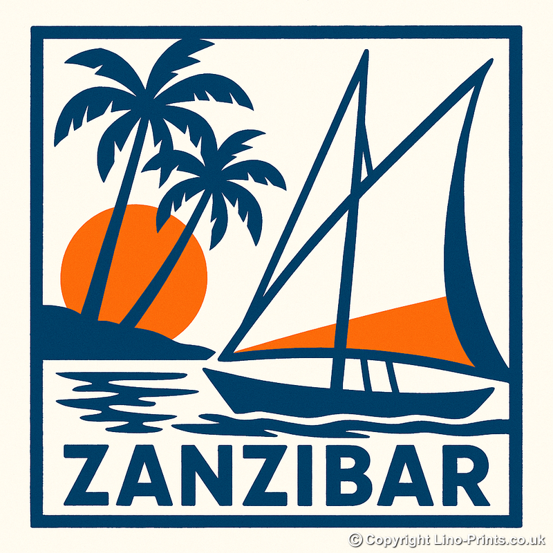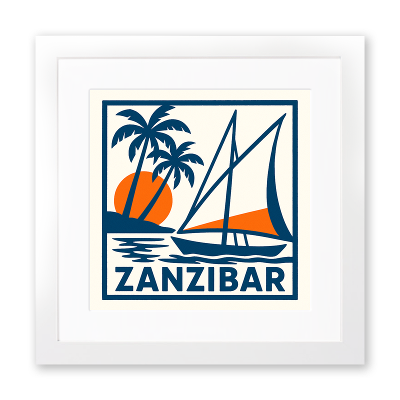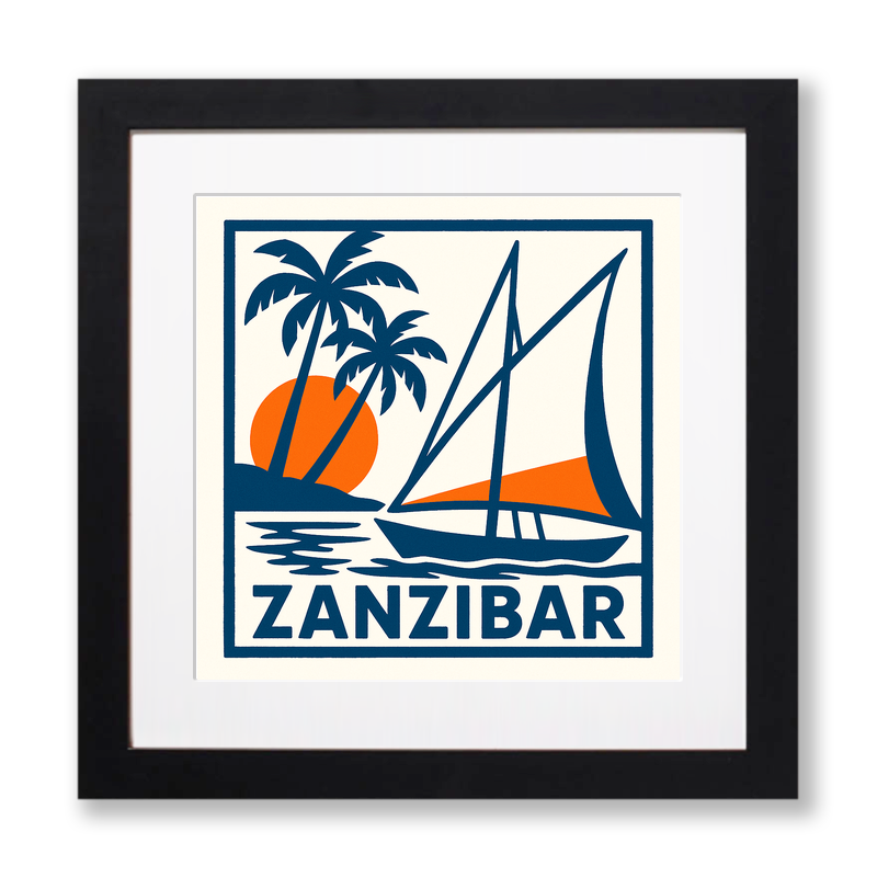 Bring a touch of exotic adventure to your space with this stunning lino-print style artwork from our Travel Posters collection, inspired by the iconic sights of Zanzibar. This print features bold, graphic lines and a striking colour palette, creating a vintage travel poster effect. At the centre, a traditional dhow with angular sails glides gracefully across tranquil waters, its silhouette set against the serene outline of palm trees on an island. The vibrant orange sun sets behind the palms, casting a warm, tropical glow and evoking dreamy evenings by the sea. The artwork is bordered by a strong blue frame, with 'ZANZIBAR' prominently displayed in bold lettering below, further enhancing its classic travel poster aesthetic. Perfectly suited to modern, minimalist, or eclectic interiors, the print is available framed in your choice of black or white, and offered in either 36cm or 46cm square sizes. For creativity at home, you can also purchase and download the original source images, line drawings, and sketches to craft your own lino print masterpiece. This piece is ideal for anyone who loves travel, unique decor, or making their own artwork.