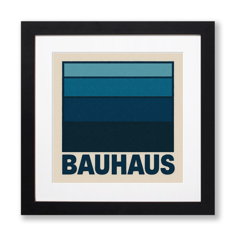 Celebrate the enduring legacy of Bauhaus with this striking lino-print style artwork from our exclusive Bauhaus collection. This piece powerfully captures the spirit of Bauhaus through its bold geometric composition and minimalist colour palette. Four horizontal bands, each varying subtly in shade from icy blue to deep navy, create a harmonious yet dynamic visual appeal within a strong square frame. The clean, precise lines and varying blocks of colour embody the Bauhaus commitment to form and function, while the textured finish adds authentic lino-print charm. Below the geometric blocks, the word “BAUHAUS” is presented in crisp, bold lettering, set against a warm, off-white background that heightens the contemporary elegance of the design.