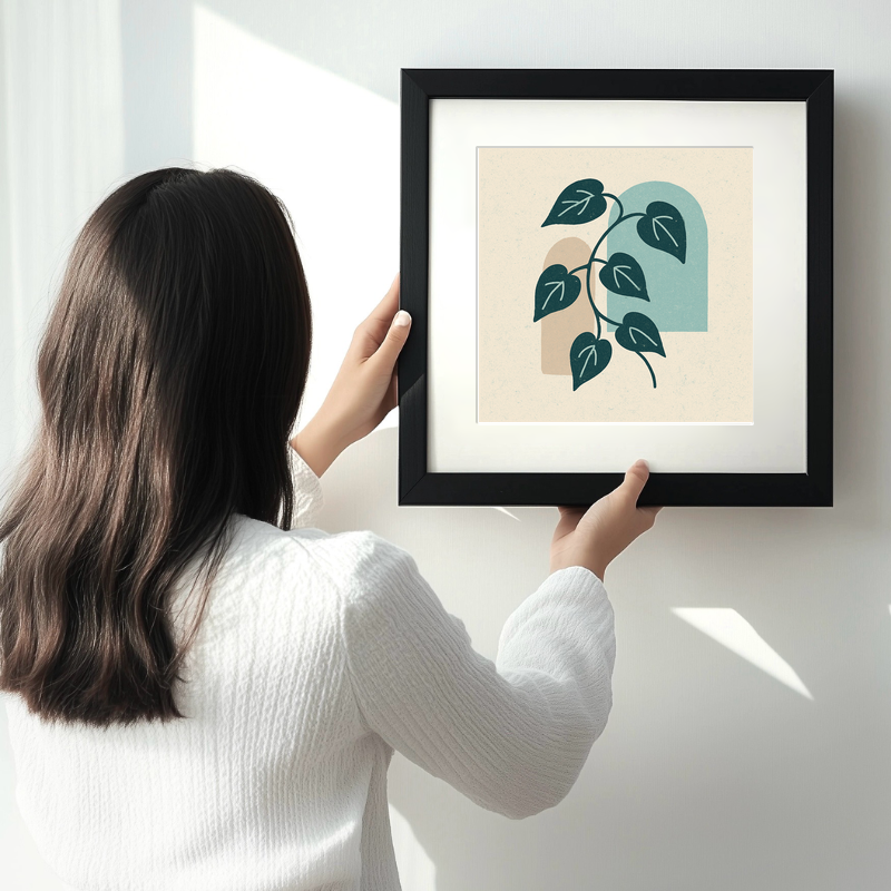 Bring a touch of botanical elegance into your home with this beautifully rendered lino-print style artwork from our Monochrome & Minimalist collection. This striking piece features a flowing plant vine, gracefully adorned with heart-shaped leaves, rendered in deep charcoal against a textured, off-white backdrop. The plant silhouette sweeps organically across the image, intersecting with two soft geometric shapes: one in muted stone beige and the other in a calm, powdery blue. The result is a harmonious interplay between the natural and the abstract, evoking a serene, modern aesthetic.