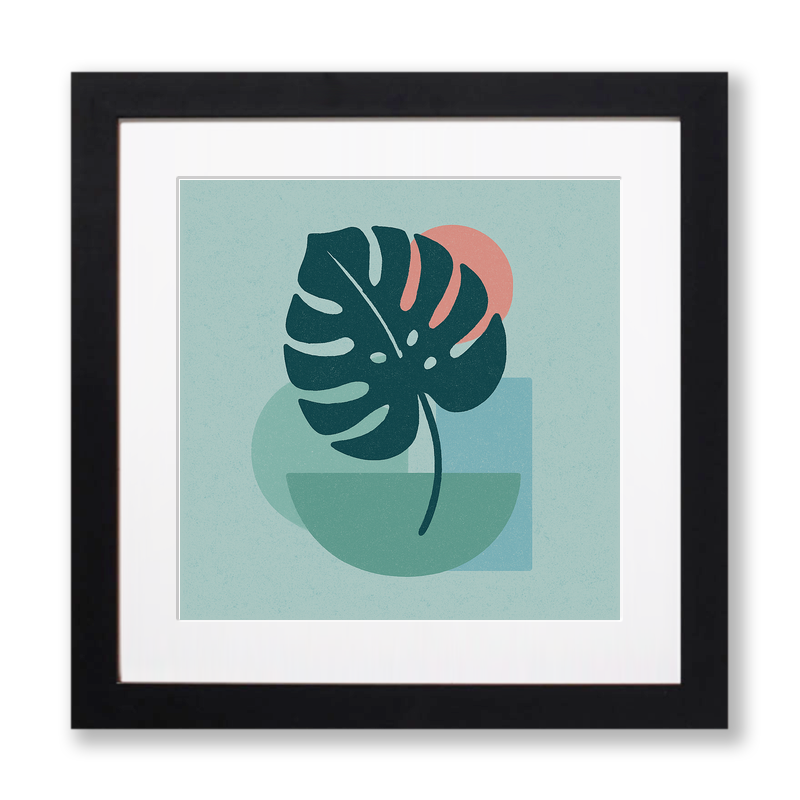 Bring a touch of minimal sophistication to your home with this beautifully crafted lino-print style artwork, featuring a striking monstera leaf as the centrepiece. The piece sits within our Monochrome & Minimalist collection, exuding calm and modernity with its clean lines and subtle yet memorable design. The deep, inky green silhouette of the monstera leaf contrasts elegantly against a muted background, composed of geometric shapes in soft pastel shades. A quiet blush circle and understated teal and aqua shapes overlap behind the leaf, adding depth while maintaining an air of simplicity. The textured finish gives the print a tactile, organic feel reminiscent of hand-pressed lino prints, making this piece both stylish and unique. Available expertly framed in either classic black or contemporary white, in your choice of 36cm or 46cm square sizing. For the creatively inclined, we also offer the option to purchase and download the original source images, including detailed line drawings and sketches, so you can bring your own lino print vision to life at home. Whether hung alone or as part of a gallery wall, this artwork is perfect for adding understated botanical charm to your living space, office, or studio.