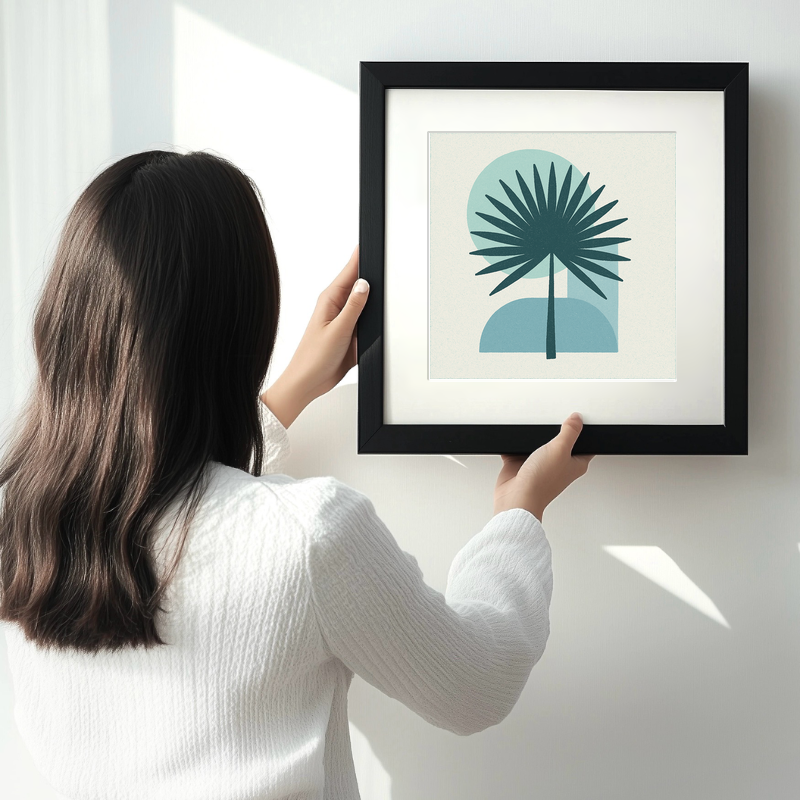 Embrace contemporary simplicity with this stunning monochrome lino-print style artwork, part of our Monochrome & Minimalist collection. The image features a stylised palm frond silhouette, radiating sharply symmetrical leaves from a slender vertical stem. Behind the bold, geometric shape of the plant, soft overlapping forms in muted teal and sky blue add depth and calm, each shape artistically textured with a subtle grain to evoke the tactile quality of traditional lino cut printing. The balance of negative space and minimal detailing creates a serene, meditative presence—perfect for any room where you desire moments of calm and clarity.