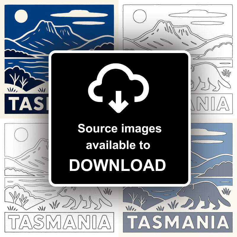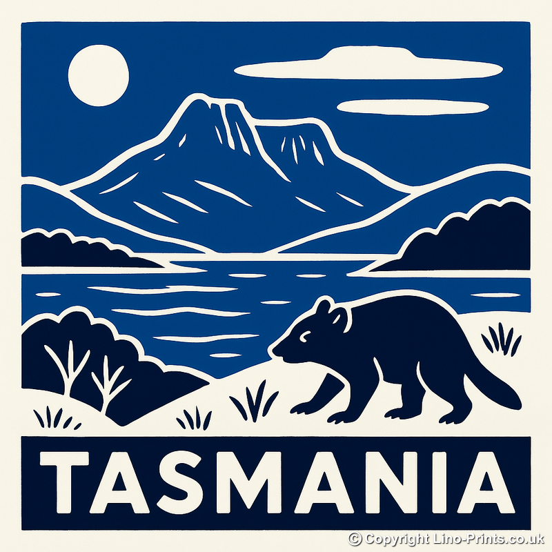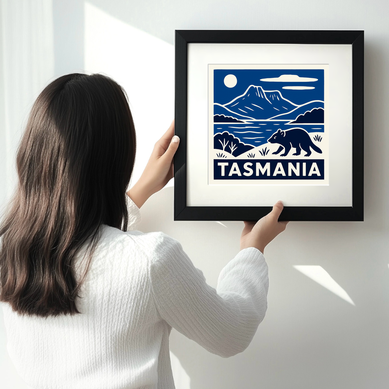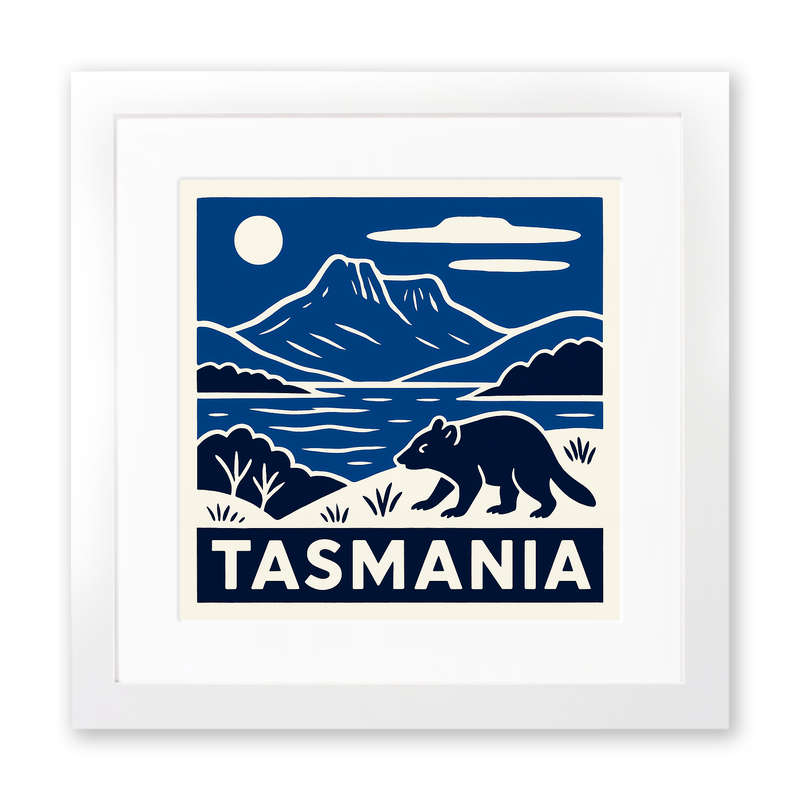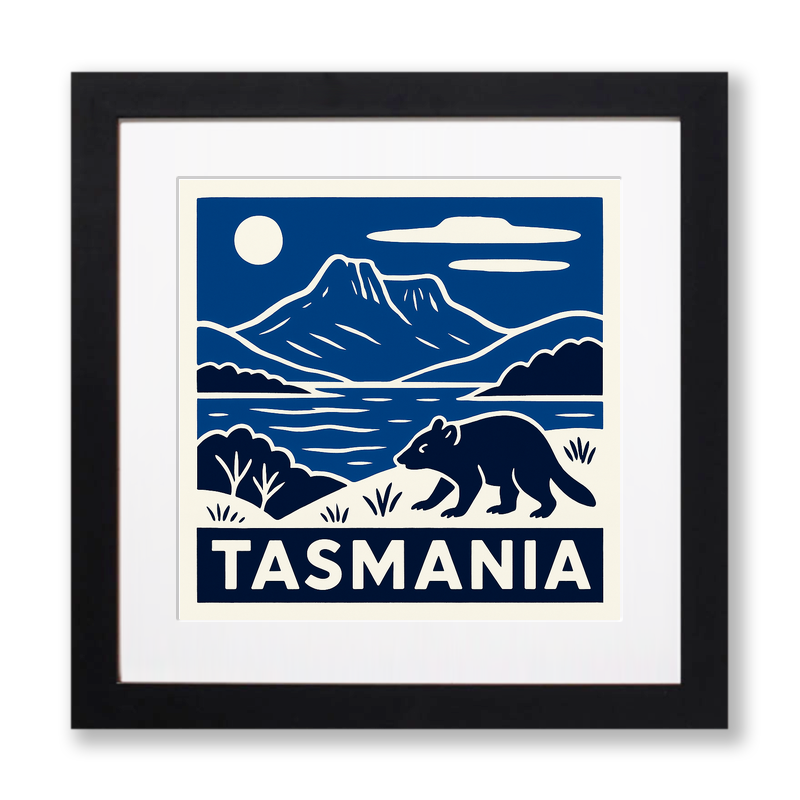 Celebrate the wild beauty of Tasmania with this striking lino-print style artwork from our Travel Posters collection. Capturing the essence of the island's legendary landscape, the design features a bold, graphic depiction of rugged mountains bathed in moonlight, serene lake waters, and rolling hills, all framed within a minimal yet evocative style. In the foreground, a silhouetted Tasmanian devil—an icon of the region—prowls amidst native foliage, grounding this piece in its untamed, natural heritage. The name 'TASMANIA' is presented prominently in a classic typeface beneath the scenic illustration, evoking the spirit of vintage travel posters and adventurous journeys. This artwork is available as a high-quality framed print, offered in both 36cm and 46cm square sizes, with a choice of sleek black or timeless white frames to suit any decor. For creative souls, you can also purchase and download the original source images, including line drawings and preliminary sketches, perfect for creating your own lino print at home. Whether you're a lover of travel, a fan of classic design, or seeking a dynamic statement piece for your space, this print brings a touch of Tasmanian wonder right to your walls.